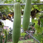 Luffa acutangula (Engels: Angled Loofah, Ridged Gourd) Populair in bv. Taiwan is deze extreem lange, slangachtige loefa. De vruchten kunnen in de tropen wel 1 m lang worden! Om rechte vruchten te krijgen: met een strengetje raphia een zakje zand aan de uiteinden binden. Jong oogsten voor consumptie, laten afrijpen voor decoratie. Kijk ook op www.luffa.info. |