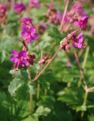 Ooievaarsbek is de Nederlandse naam voor de tuingeranium, niet te verwarren met de geraniums die in bloembakken en potten worden geplant, deze planten heten Pelargonium. Het blad is rond, iets harig en zeer geurig! Van deze soort wordt vaak geraniumolie gemaakt. Ze vormen een stevige, kruipende, wintergroene basis voor de roodpaars tot purperen bloemen. Gemakkelijke teelt en zeer winterhard.
