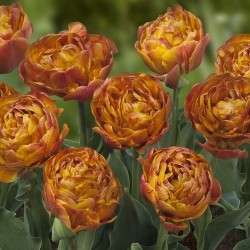 Middenhoge tulp met dubbele bloemen (meerdere rijen bloembladen). Lange bloei! EXCLUSIEVE TULP! Een spannende kleur tussen koperbruin en mat oranje.