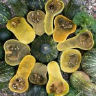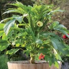 Luffa acutangula (Engels: Angled Loofah, Ridged Gourd) Populair in bv. Taiwan is deze extreem lange, slangachtige loefa. De vruchten kunnen in de tropen wel 1 m lang worden! Om rechte vruchten te krijgen: met een strengetje raphia een zakje zand aan de uiteinden binden. Jong oogsten voor consumptie, laten afrijpen voor decoratie. Kijk ook op www.luffa.info. |