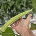 Abelmoschus esculentus (Engels: Okra, Lady's Finger) Een geliefd ras in de VS, al bekend sinds 1950, vermaard vanwege de grote oogst en het lang mals blijven van de vruchten. De planten worden 1-1,5 m hoog en dragen na de fraaie, gele bloei een mooie oogst aan lichtgroene, vrij lange vruchten: 18-22 cm. Je oogst de vruchten in elk stadium, maar in te rijp stadium worden okravruchten taai. |