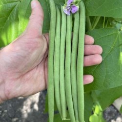 ECO GETEELDE ZADEN! Een moderne topper: de boon met de volmaakte vorm! Middenlange, goed gevulde en zeer vlezige boon: 9-11 mm dik en 18-20 cm lang. Oogsten wordt vergemakkelijkt door de opvallend grote trossen, ze dragen lang door. De sterke groeikracht zorgt voor een vitaal gewas, ook als het weer even tegen zit. Deze absoluut draadloze boon is resistent tegen virus 1 en kan ook goed in de kas geteeld worden. Opvallend is de zwarte zaadkleur, de mooie lila bloei en vrij donkergroene peulen en de zeer goede smaak!