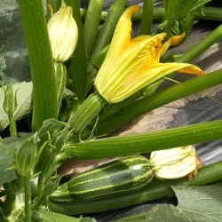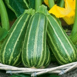 Een prachtige courgette die al zeer aantrekkelijk en volgroeid lijkt als deze jong geoogst wordt. Oogst ze vanaf een lengte van 10-15 cm, dan zijn ze al groen met lichtgroene, opliggende ribben. De plant is tamelijk open van groei, waardoor oogsten makkelijk is.