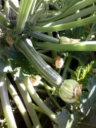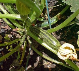 Courgettes kunnen probleemloos buiten worden geteeld. Dit ras rankt niet, de vruchten groeien vanuit het centrum van