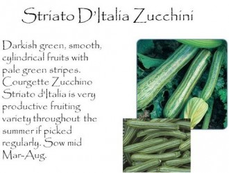 Een vroeg soort uit Italiaanse traditie, die (uiteraard jong geoogst) heerlijk mals is. Laten doorgroeien kan ook: dit soort heeft prachtige gele strepen op de donkergroene vruchten, die alleen maar fraaier gaan aftekenen. Als grote uitgegroeide vrucht is een courgette enkele maanden (voor de sier) houdbaar.