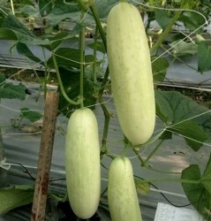 De oogstlengte van deze frisse, smakelijke komkommer is 20-30 cm, maar het is ook leuk om enkele te laten doorgroeien tot de volle 50 cm lengte, het vruchtvlees is dan zachter en geel. Deze komkommer groeit zeer goed in de kas en tijdens de meeste zomers goed buiten. Voor het enten van komkommers gebruik je dit ras: 133000 ‘Boule de Siam’. Als hulpmiddel bevelen we je deze entclips aan: 847525 Entclip 2,5 mm. ZaaimethodeZaaien: binnen vanaf eind maart - eind mei. De meeste rassen groeien goed buiten (zie de rasbeschrijving), in de kas is het succes en de oogst groter. Uitplanten: in de kas vanaf eind april, buiten vanaf eind mei. Niet alleen op de datum, maar vooral op het weer letten! Leveringsmaandenhet gehele jaar