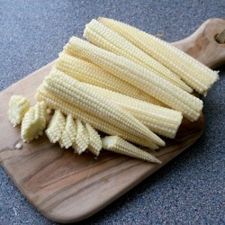 Malse minimaïskolfjes, die bij vroege oogst 4-6 kolfjes geeft van ca.13 cm lang. Vroege oogst betekent: als de korrel nog niet ontwikkeld is, dus vrijwel direct na het ontstaan van de kolfschacht. Leuk als garnering in de salade! Heeft u toch te laat geoogst dan zijn de rijpe korrels eventueel te poffen.