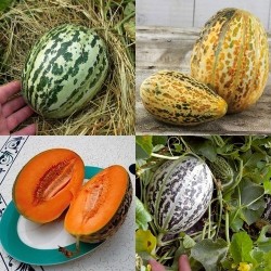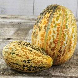 Deze bijzondere meloen komt uit 1 van de vele kruisingen tussen ‘Noir des Carmes’ en ‘Prescott a fond Blanc’. Allereerst valt de goede groeikracht in de vollegrond op, vervolgens overleeft de plant menige zomerse koudegolf en zelfs in de herfst blijft de plat goed intact en rijpen de vruchten prima af. Een goede kanshebber voor ons klimaat dus... De vruchten zijn ovaalrond, lichtgroen met donkergroene strepen (in rijpe vorm meer gele tinten) en oranje vruchtvlees. De smaak van goed aan de plant gerijpte vruchten is hemels en vele malen beter dan een gekochte vrucht in de winkel…