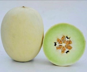 Wintermeloen (Inodorus groep) Na de oogst rijpende meloen, die lang bewaard kan worden. De vorm is rond tot (lang)ovaal, de schil is vrij glad, soms iets geplooid en/of geribd. De schilkleur varieert per ras van wit, geel tot zwartgeel gestreept. Het vruchtvlees is stevig en zoet in de kleuren wit, geel of oranje. Deze Aziatische, witte meloen heeft heerlijk zoet, groenwit vruchtvlees. Ze zijn erg populair in Taiwan en Japan en daar weten ze wat smaak is! De schil kan zelfs geschild worden! Dit professionele ras is vroeg en zeer gezond, de vruchten wegen 1,5-2,5 kg en zijn lang te bewaren. Alleen voor teelt onder glas.