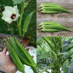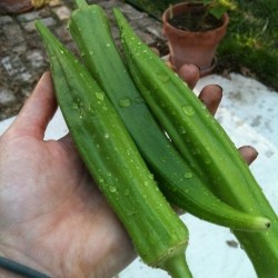 Okra is een veelzijdige en sierlijke, geel- of witbloeiende zomergroente met veel eetbare delen! Het belangrijkste en bekendste deel zijn de peulvormige vruchten. Deze zijn zeer jong geoogst het lekkerst en worden gebakken, gekookt (maakt sauzen en soepen dikker) of ingelegd in zuur. De heerlijk zachte textuur is zeer geliefd in de Mediterrane en Aziatische keuken. De zaden kunnen worden vermalen of gekookt en verwerkt in brood of Tofu en Tempeh. Geroosterd zaad is een van de beste koffievervangers! Het blad, de bloemknoppen en bloemen zijn eetbaar in roerbakschotels of soepen. Het blad kan ook goed worden gedroogd voor later gebruik in de soep. Tenslotte zijn de wortels ook eetbaar voor het bereiden van bijvoorbeeld een groentebouillon, na het trekken de wortels weer verwijderen, ze zijn taai. Heel populair in Midden-Amerika en Zuid-Amerika (Surinaamse keuken bijvoorbeeld) Het standaard-ras, van waaruit veel andere rassen zijn ontstaan. De groeikrachtige planten worden ongeveer 1,5-2 m hoog en na de crèmewitte bloei ontstaan ongeveer 15 cm lange vruchten. Jong plukken geeft de meest malse resultaten.