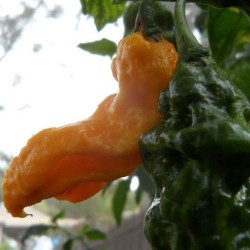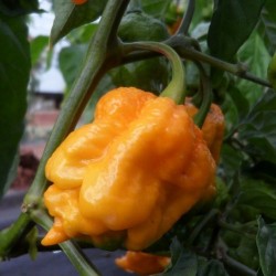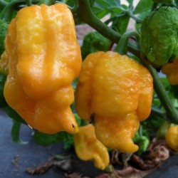Uit de (zeer hete) rode 7 Pot Primo (uit Trinidad) is deze gele mutatie ontstaan en als apart ras doorgegeven. Voorlopig blijft deze nog geel, hoewel we de soortechtheid in de toekomst niet kunnen voorspellen... Deze gele variëteit is iets minder heet, iets zoeter met een tikje citroenaroma. De planten groeien ongeveer 80-100 cm hoog. De naam dankt deze hete peper aan de eigenschap, dat je met 1 peper wel 7 stoofpotten voldoende scherpte kan geven!