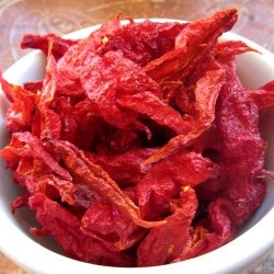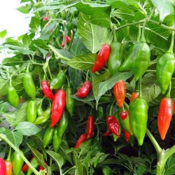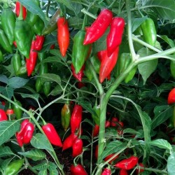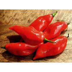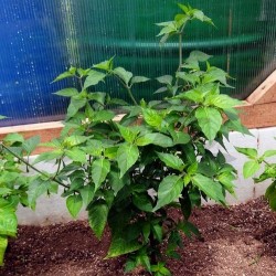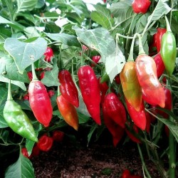 Een echte Habanero (of Adjuma) voor de Noordelijke landen. De planten groeien iets compacter (75-100 cm) en vormen een overvloed aan 7-8 cm lange en 2,5 cm brede, iets gekreukte vruchten die rijpen van lichtgroen via oranje naar helderrood. Ook deze Habanero is mondverzengend heet met (voor de geoefende eter) een heel eigen aroma. Regenachtige zomers geven iets mildere resultaten.