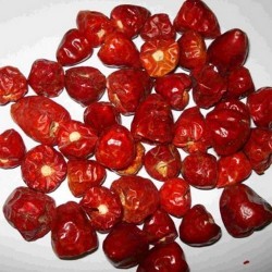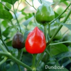 Eigenlijk is dit geen ras maar een type. In Pakistan noemt men nakomelingen van de Capsicum frutescens en C. annuum Dundicut of Lal Mirch. Als de pepertjes maar klein zijn! Meestal worden ze gedroogd aangeboden en zijn dan zo klein als krenten! Onze Dundicut geeft rechtopstaande vruchten, druppelvormig, aan vrij hoge planten: 150 cm. De smaak is fris, complex en zeer heet, te vergelijken met Habanero’s. Dit pepertje wordt veel gebruikt in papegaaienvoer, vogels hebben geen last van hitte in pepers.