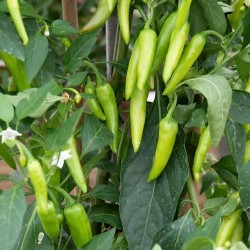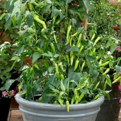 Een vrij heet pepertje met stevige en fruitige aroma’s! De planten zijn bossig en vrij compact, vroeg oogstbaar, ze worden ongeveer 50-75 cm hoog en groeien mooi in een flinke pot. Dit vruchtbare hybride-ras is al zeer goed op smaak als de vruchtjes groen zijn, als je ze laar rijpen naar rood, dan ontstaan iets zoetere tonen. De pepertjes zitten hangend aan de plant, de afmeting per vruchtje is 8x2 cm, je kan ongeveer 100 (!) stuks aan een plant verwachten. 39.000 SHU.