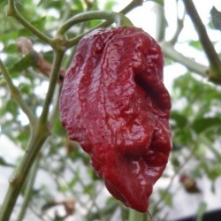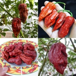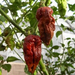 Echte peperfreaks proberen steeds hetere vruchtjes te telen, deze kruising tussen ‘Bhut Jolokia Chocolate’ x ‘7 Pot Yellow’ is weer zo’n doorbraak in hitte. Alleen ervaren eters kunnen ze aan en (zoals de naam al zegt) met 1 peper kan je 7 gerechtpotten van hitte voorzien! De iets kreukelige, conische vruchten rijpen van lichtgeel, via oranje en rood naar bruinrood van kleur.