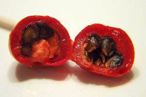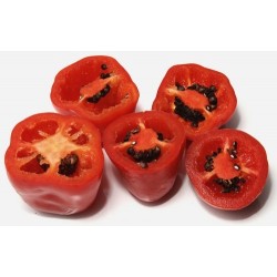 Rode vruchten. Al meer dan 5000 jaar (vroeger door de Berg-Inca’s) is deze koudebestendige peper in cultuur. Enkele graden vorst is geen probleem, maar laat het er niet op aankomen! De (ovaal)ronde tot iets blokkige, dikwandige, vruchten zijn 5 cm, hebben typerende zwarte zaden en worden voorafgegaan door blauwe bloemen! De plant is harig en groeit flink. Door de late rijping is het slim om de planten in pot te telen, zodat ze in oktober binnen gezet kunnen worden. In de winter mogen planten worden teruggesnoeid en zullen het jaar erna weer trouw vrucht dragen, jaar in jaar uit! Behoorlijk heet!
