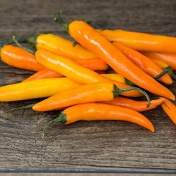 Heel veel helderoranje vruchten aan een compacte plant (50 cm)! Mooie langwerpige en slanke pepertjes, flink heet en heerlijk fruitig van smaak. Prima geschikt voor de teelt in potten op balkon of terras. Wel in de volle zon zetten (uiteraard)!