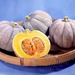 Prachtige vruchten met een doorsnee van 15-20cm en een gewicht van 1-2kg. Duidelijk geplooid, okergeel met een blauw-groen netwerk en beeldschone doffe waslaag. Dit lang bewaarbare hybride-ras is ziektebestendig.