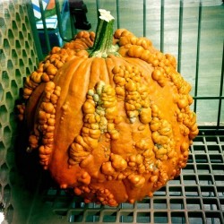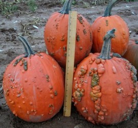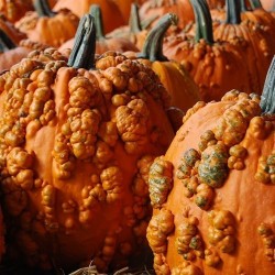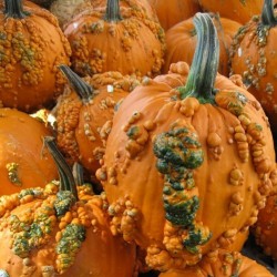 Pompoenen kunnen probleemloos buiten worden geteeld. De groeitoppen kunnen regelmatig worden gesnoeid en zijn eetbaar! Oogsten tijdens droog weer geeft de beste bewaarbaarheid. Alle pompoenen zijn eetbaar! Bij sommige soorten vermelden we de synoniemen, dat zijn de namen waaronder het soort ook bekend is. Bij andere soorten vermelden we zeer gelijkende soorten, heeft u duidelijk voorkeur voor een van die bij elkaar vermelde soorten, geef dat dan duidelijk aan. Een echte oranje halloweenpompoen met goede, normale consumptiekwaliteit, maar daarnaast ook extra sierlijk door de grote, vaak groene (soms oranje) knobbels. De vruchten kunnen 5-10 kg zwaar worden, afhankelijk van de zomer en de grondsoort.