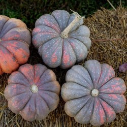 We zijn erg blij dat we het mooie sortiment van Outstanding Seed Company kunnen verkopen. Dit Amerikaanse bedrijf uit Beaver Falls (Pennsylvania) is gespecialiseerd in het kweken en verbeteren (door traditionele veredeling) van pompoenen. Ze letten daarbij op verbetering van kleur, vorm, smaak, ziekteresistentie, oogsttijdstip, oogstgrootte en bewaarbaarheid. Fijn om rechtstreeks bij de bron te kunnen kopen! Weer een beauty met als toegift veel smaak en betrouwbare ziekteresistentie. De rankende planten dragen veel vruchten van 20-25 cm doorsnee en ongeveer 15 cm hoog. De pompoenen zijn prachtig paarsgrijs gemarmerd met perzikrood, sommige vruchten hebben verschillende tinten blauw tot grijs en veel vruchten zijn gespikkeld. Je kan de meeste van deze scherp geribde pompoenen goed stapelen, gemiddeld wegen ze 6-7 kg.