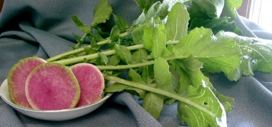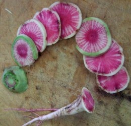 Grote Chinese radijs, oogsten bij een grootte van 5 cm; de knollen zijn aan de buitenkant wit, maar als je ze doorsnijdt geeft de radijs zijn geheim prijs... egaal