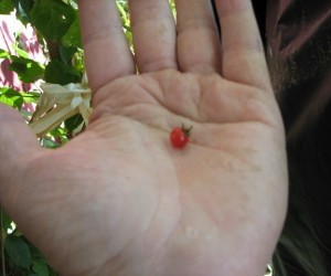 De kleinste tomaatjes in ons sortiment noemen we kerstomaatjes of pingpongtomaatjes, naargelang de grootte. Enkele variëteiten zijn langwerpig of hartvormig en krijgen navenant een iets andere benaming. Sommige zijn zelfs oorspronkelijke, wilde soorten. De meesten smaken extra zoet, een enkeling heeft een zoetzure smaak. Kerstomaten liggen het dichtst bij de oorspronkelijke soorten, wellicht daardoor zijn ze o.h.a. beter bestand tegen de gevreesde aardappelziekte. Een wild tomaatje met unieke eigenschappen. De rode, heerlijk zoete vruchtjes zijn zeer klein, rijpen vroeg en zijn in de vorm en grootte net minihazelnootjes of aalbessen! De eerste groei van de plant doet sterk aan een aardappel denken, totdat de gele bloemenzee ontstaat… De plant blijft vrij laag (1m) en groeit ook goed in een grote pot. De oogst begint in juli tot de vorst invalt.