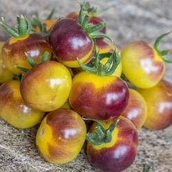De kleinste tomaatjes in ons sortiment noemen we kerstomaatjes of pingpongtomaatjes, naargelang de grootte. Enkele variëteiten zijn langwerpig of hartvormig en krijgen navenant een iets andere benaming. Sommige zijn zelfs oorspronkelijke, wilde soorten. De meesten smaken extra zoet, een enkeling heeft een zoetzure smaak. Kerstomaten liggen het dichtst bij de oorspronkelijke soorten, wellicht daardoor zijn ze o.h.a. beter bestand tegen de gevreesde aardappelziekte. Een prachtig kerstomaatje, crèmewit met een blauw bovenzijde, hoe meer zon hoe meer blauw. Het anthocyaan dat de blauwkleuring veroorzaakt geeft aan dit smaakvolle tomaatje een extra gezonde touch. Klimmende variëteit.