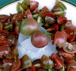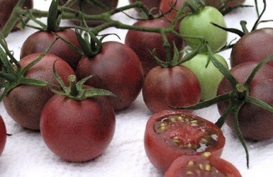 De kleinste tomaatjes in ons sortiment noemen we kerstomaatjes of pingpongtomaatjes, naargelang de grootte. Enkele variëteiten zijn langwerpig of hartvormig en krijgen navenant een iets andere benaming. Sommige zijn zelfs oorspronkelijke, wilde soorten. De meesten smaken extra zoet, een enkeling heeft een zoetzure smaak. Kerstomaten liggen het dichtst bij de oorspronkelijke soorten, wellicht daardoor zijn ze o.h.a. beter bestand tegen de gevreesde aardappelziekte. Dit is de eerste (bijna) zwarte kerstomaat die we hebben goedgekeurd voor ons sortiment. Het is een perfect ronde kersvorm met de klassieke zwarte-tomaten-smaak: zoet en toch rijk en complex. De stevige, hoge planten produceren in overvloed! Weer een unieke toevoeging aan het kleurenspectrum van de kerstomaten!