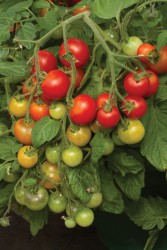 De plant vormt een stevige basis van zo’n 15 tot 40 cm hoog, om vervolgens haar takken als een sierlijke, groene waterval over de rand van een hanging basket of verhoogde kweekbak te laten storten. Deze weelderige ranken kunnen wel 90 cm lang worden! Het is een spectaculair gezicht wanneer de plant zich vult met trossen glanzende, dieprode knikkers van zo'n 15-20 gram per stuk. De smaak is precies zoals een echte zomertomaat hoort te zijn: een explosie van zoet sap met die onmiskenbare, friszure ondertoon. In een goede zomer is deze plant ongekend gul; reken op een oogst van wel 80 van deze sappige snoepjes van één enkele plant. ZaaimethodeZaaien: maart-mei binnen. Bij een hoogte van 5 cm in potjes verplanten. Zeer licht zetten en vanaf april bij mooi weer buiten afharden. Buiten uitplanten niet voor eind mei. Teelt in de kas uiteraard probleemloos. Tomatenplanten gebruiken veel water. Dit zgn. struiktype (zelftopper) hoeft niet te worden gediefd. Plantafstand 60-80 cm. Leveringsmaandenhet gehele jaar