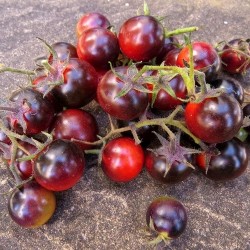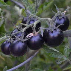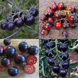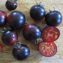 De kleinste tomaatjes in ons sortiment noemen we kerstomaatjes of pingpongtomaatjes, naargelang de grootte. Enkele variëteiten zijn langwerpig of hartvormig en krijgen navenant een iets andere benaming. Sommige zijn zelfs oorspronkelijke, wilde soorten. De meesten smaken extra zoet, een enkeling heeft een zoetzure smaak. Kerstomaten liggen het dichtst bij de oorspronkelijke soorten, wellicht daardoor zijn ze o.h.a. beter bestand tegen de gevreesde aardappelziekte. Prachtige, donkerviolette vruchtjes, hoe meer zon, hoe dieper de kleur. De smaak is opvallend goed en de klimmende planten tonen ook de blauwgroene stengels en bladeren. Dit alles dankzij de gezonde stof anthocyaan, die ook bijvoorbeeld in aubergine, kersen en bosbessen zit.