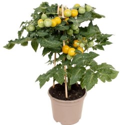 De kleinste tomaatjes in ons sortiment noemen we kerstomaatjes of pingpongtomaatjes, naargelang de grootte. Enkele variƫteiten zijn langwerpig of hartvormig en krijgen navenant een iets andere benaming. Sommige zijn zelfs oorspronkelijke, wilde soorten. De meesten smaken extra zoet, een enkeling heeft een zoetzure smaak. Kerstomaten liggen het dichtst bij de oorspronkelijke soorten, wellicht daardoor zijn ze o.h.a. beter bestand tegen de gevreesde aardappelziekte. Sterke, ziekteresistente struiktomaat, die compact blijft en dus heel goed in potten of bakken geteeld kan worden! De gele, bolronde vruchtjes (8 gram) smaken friszoet en groeien aan korte trsojes rondom het hart van de plant. Je plukt de hele zomer verse kerstomaatjes.