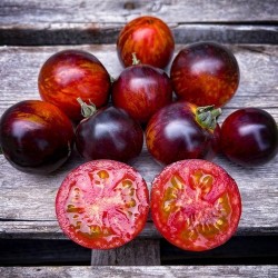 Prachtige tomaten in oranjerode kleur met paarse bovenkant en strepen. Deze tomaat ontwikkelt o.i.v. zonlicht de gezondhoudende stof anthocyaan, die de blauwkleuring in de vruchten veroorzaakt. Dit ras is (middels natuurlijke kruisingen) ontwikkeld door Mark McCaslin in de VS. De middenkleine vruchten wegen tussen de 80-150 g en zijn sappig, smaakvol met een goede balans tussen zoet en zuur. De planten blijven tamelijk compact, ongeveer 1m en kunnen gemakkelijk met enkele stokken worden gestut, niet dieven.