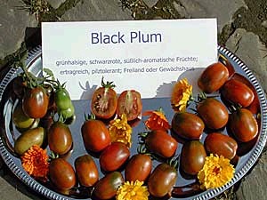 Deze groep tomaten zijn van een formaat tussen kerstomaat en vleestomaat in: middelmaat dus. Zij hebben ieder voor zich een uniek karakter. De klimmende rassen rijpen wat later dan de compacte rassen en zijn daardoor succesvoller onder regenbescherming: een afdak, kas of kweektunnel. Een tomaatje om direct verliefd op te worden! Zeer donkerrood tot zwarte kleur en de vorm (en maat) van een pruimpje. Als toegift zijn ze sappig en heerlijk zoet. Zelden hoor ik zoveel lovende woorden over de smaak!