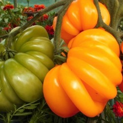 Deze prachtige vleestomaat heeft veel fijne ribben, waardoor de gelijkenis met een accordeon zich opdringt... Het gewicht van deze oranje (met rode strepen) vruchten is ongeveer 400-500 g, flinke tomaten met veel vruchtvlees en een uitstekende smaak. De plant kent een matige, maar wel klimmende groeiwijze.