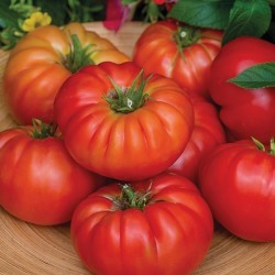 De grootste tomaten in ons sortiment heten vleestomaten. De naam dankt deze tomaat aan de grotere hoeveelheid vruchtvlees (i.p.v. sap). Bij de meeste variëteiten van deze groep gaat dat op, enkele uitzonderingen zoals de zgn. vultomaten. Het is altijd fijn te merken, dat er zaadhuizen zijn die extra op smaak letten! Deze zeer vruchtbare vleestomaat (250 g) groeit erg gezond, het liefst in de kas, maar met steun is de buitenteelt een goede optie. Burpee heeft zijn reeds bestaande ras ‘Tomande’ doorontwikkeld, verbeterd en iets zwaarder gemaakt. En... zoals vermeld: heel aromatisch! Geïntroduceerd in 2016.