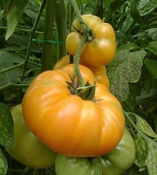 De grootste tomaten in ons sortiment heten vleestomaten. De naam dankt deze tomaat aan de grotere hoeveelheid vruchtvlees (i.p.v. sap). Bij de meeste variëteiten van deze groep gaat dat op, enkele uitzonderingen zoals de zgn. vultomaten. Een topper onder de helderoranje vleestomaten! De Amerikaanse kenner Carolyn J. Male prijst de smaak van deze grote tomaat: "The whopping taste of this mighty tomato is truly unequaled…". "Voluit vlezig en toch sappig" en "zeer rijk aroma" dagen u uit om dit ras eens te telen. De grote planten dragen rijk.