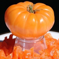De grootste tomaten in ons sortiment heten vleestomaten. De naam dankt deze tomaat aan de grotere hoeveelheid vruchtvlees (i.p.v. sap). Bij de meeste variëteiten van deze groep gaat dat op, enkele uitzonderingen zoals de zgn. vultomaten. Deze prachtige, oranje vleestomaat stamt uit het begin van de 20e eeuw, een echte historische volhouder! Dan moet je wel iets te bieden hebben... Van oorsprong komt dit ras uit Noord-Siberië, rond de stad Tobolsk. Dat belooft een zeer goede aanpassing aan koele zomers! De smaakbalans is perfect, voldoende zoet met sterke aroma’s.