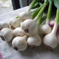 ZaaimethodeKnoflook kan jaarrond worden geplant, als de teentjes in goede conditie zijn. De meeste rassen zijn in herfst en winter op voorraad. Wij voeren rassen, die succesvol in Nederland worden geteeld. Meteen na ontvangst de bol openbreken en de tenen in de grond poten: 2-5 cm diep en 10-20 cm uit elkaar. In het najaar geplant staat de knoflook in februari (of eerder) al boven en in juni-juli kunnen ze geoogst worden. Later geplant betekent uiteraard latere oogst. Oogsten is geen verplichting, knoflook is winterhard en kan ook gewoon in de grond blijven. Na oogsten het loof vlechten zoals je knoflook wel eens in de winkel ziet en de bollen in de zon drogen. In de kamer zijn ze soms wel een jaar te bewaren! De teelt is niet moeilijk, maar goede tips vind je in onze teeltbeschrijving in pdf (zie onderaan de website). Knoflook schijnt luizen in b.v. rozen te weren, het proberen waard!