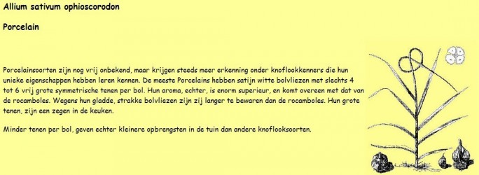 Een mooie grote donker groene plant. De bol heeft mooie satijnwitte vliezen met 4-6 grote tenen. De smaak is sterk en robuust en blijft lang hangen. Door de gladde strakke bolvliezen zijn ze lang te bewaren. De bloemsteel heeft vaak de vorm van een krakeling.
