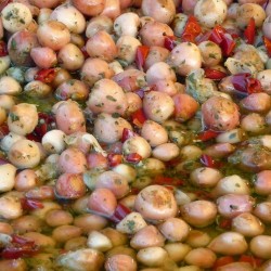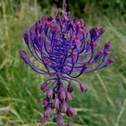 LEVERBAAR VAN SEPTEMBER-DECEMBER. Rond de Middellandse Zee is het bolletje van de sierlijke Kuifjesdruif of Kuifhyacint al duizenden jaren bekend als een voedzame lekkernij en (omdat het langs de hellingen in het wild groeit) typisch voedsel dat al snel na de laatste Ijstijd werd genuttigd. Vooral de Italianen hebben het klaarmaken (koken en inzuren) van deze bolletjes tot kunst verheven, vandaar dat we ze tot Lampascioni hebben gedoopt, de originele streeknaam, zoals ze in Zuid-Italië en Sicilië bekend zijn. Ze lijken op inmaakuitjes, maar smaken uniek: een stevig aroma, een tikje bitter en pikant, maar bij goede bereiding net zuur genoeg om tot een “buonissimi” te komen! De Grieken noemen de bolletjes overigens “Voulvi”. Er is iets vreemds met bitterheid in smaak… Wij proberen het weg te werken maar met de juiste combinatie, bijvoorbeeld met “Fave e Cicoria” (bonenpuree met cichorei) ontstaat er een Mediterrane smaak, die het leven zelf aldaar symboliseert: de zoete bitterheid. Zoet en bitter: de een kan niet zonder de ander!