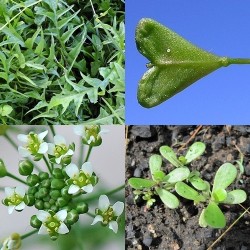345570 HERDERSTASJEook wel genoemd: LEPELTJESDIEF, TASJESKRUID, BLOEDKRUID, EENDEPOOTJES, GANZETONGEN, LEPELS EN VORKEN, MOEDERSTASJE, TUINLEPELTJE (Engels: Shepherd's Purse)(Capsella bursa-pastoris) |