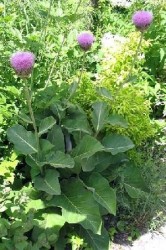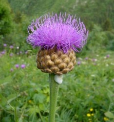 In Mongolië en Rusland worden de wortels van deze plant gebruikt als spierversterker, een soort natuurlijke Anabole! Verder schijnt het de levenszin en de conditie te vergroten. Een zeer sterke tuinplant, die lekker in de zon kan staan. De bloemvorm doet me sterk denken aan de Centaurea macrocephala of aan artisjokken, maar dan in een prachtige, lilaroze kleur. Het grote, puntige blad is ook best sierlijk. Hoogte 70-90 cm, bloeitijd juli-augustus. Zie ook als plant: 831857.