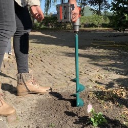 Je moet er maar opkomen... Een echte grondboorspecialist kwam op het lumineuze idee om mooie gaatjes te boren met een Vijzel Spiraal Boor dat op een (accu)boortol past.