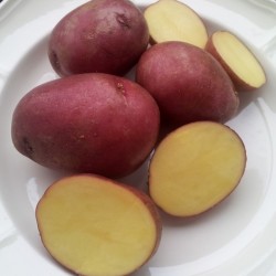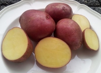 Een prachtige, moderne aardappel met veel toepassingsmogelijkheden. Ondanks de vroege oogst is deze zeer goed te bewaren! De iets ovaalronde knollen hebben een helderrode schil met lichtgeel knolvlees. Jong gegeten zijn ze tamelijk vast, bij langere bewaring worden ze bloemiger. Ons smaakpanel roemde het fijne aroma. De knol is goed resistent tegen Phytophthora en je kan een zeer grote oogst verwachten. ‘Tiamo’ kan ook in warmere landen rond de Middellandse Zee geteeld worden. Een klant mailde ons: “Hierbij een foto (met snoeischaar) van de oogst van 5 planten Tiamo aardappelen. Het zijn harde, vastkokende aardappelen die dicht onder de oppervlakte zitten. De smaak is fantastisch, evenals het schilgemak.” Een klant meldde ons, dat de Coloradokever (ondanks aantastingen elders) van dit ras afbleef!