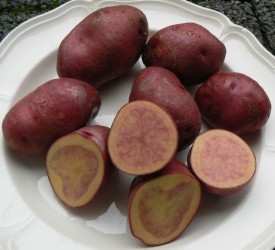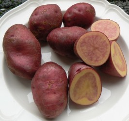 Een vrij recente kruising tussen Desiree x Red Burgundy, die zich uit in een mooie, roodschillige aardappel, vrij rond van vorm en roodgewolkt knolvlees. Ik kookte ze met schil en al om ze vervolgens te pellen: prachtig rood onder het schilletje! De smaak is toegankelijk en aangenaam, bloemig en kruimig: zeer geschikt voor purée, bakken en frituren.