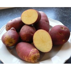 ECO GETEELDE AARDAPPELS. (1870) Lang is dit oude rasje “kwijt” geweest, gelukkig is iedereen aan het speuren naar oude streekrassen en kwam deze Zeeuwse, lekkere en iets kruimige aardappel weer uit het kleine circuit. Het is een zeldzame mutant uit de ‘Zeeuwse Blauwe’ (ook bekend als ‘Gelderse Blauwe’ of ‘Turken’), die waarschijnlijk al uitgestorven is en de naam dankt deze “bonte” aan de 2-kleurige schil, die rood met beige vlekken is. Het knolvlees is ongekookt tamelijk geel, na het koken wat witter. ‘Koopmans Blauwe’ is overigens ook een nakomeling van de ‘Zeeuwse Blauwe’, de verwantschap is te merken aan het zalvende mondgevoel: geen vaste aardappel, maar een structuur er tussenin. Ik vind hem heerlijk.