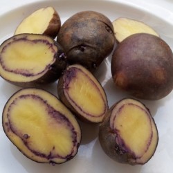 Een mooi Peruaans ras dat in ons klimaat een kleine oogst geeft, maar desondanks toch zeer interessant is omdat je er de oorspronkelijke aardappel mee kan proeven. De bolronde knollen hebben een donkerpaarse schil en lichtgeel knolvlees met een paarse ring. De aardse, aromatische smaken zijn typerend voor de Zuid-Amerikaanse aardappel em de structuur is fijnbloemig.