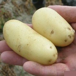ECO GETEELDE AARDAPPELS. (2003) Kruising tussen ‘Rozen’ en ‘Monalisa’. Dit typisch Franse ras geeft zeer smakelijke, lang-ovalen knollen van vaste structuur. De culinaire wereld is erg happig op dit ras! Gekookt is deze lekkernij zowel warm als afgekoeld erg geliefd: Omdat het ras vroeg oogstbaar is heeft deze een korte kiemrust, dus bewaar ze niet te lang. De opbrengst is vrij hoog!