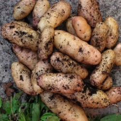 (1997) Desireé x Pink Fir Apple. Weer een ras van het Scottish Crop Research Intitute, jarenlang exclusief geteeld voor de beroemde Sainsbury’s Supermarktketen. Nu is deze heerlijke salade-aardappel beschikbaar voor iedereen! Het historische uiterlijk: (iets) knobbelig en vingervormig is bewust behouden als beeldmerk voor een vaste, zoete, notige aardappel. De voordelen t.o.v. de “oudjes”: (veel) grotere productie en betere ziektebestendigheid. De schil is geel met af en toe een rozerode blos. Middenvroeg.