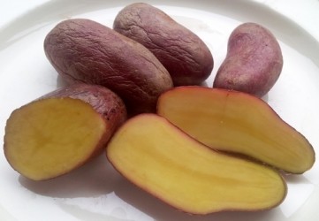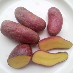 Een vroeg oogstbare en toch vaste aardappel! De muisvormige knollen met rozerode schil herbergen lichtgeel knolvlees. De mooie, vaste textuur en lichte, toegankelijke smaak maakt deze aardappel tot een aanrader. Ze zijn niet lang te bewaren, de foto laat de knollen zien na (te) lange bewaring...